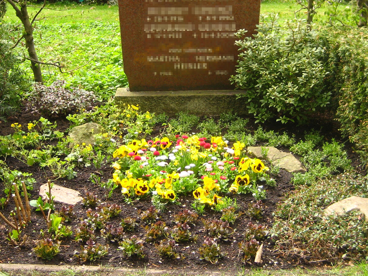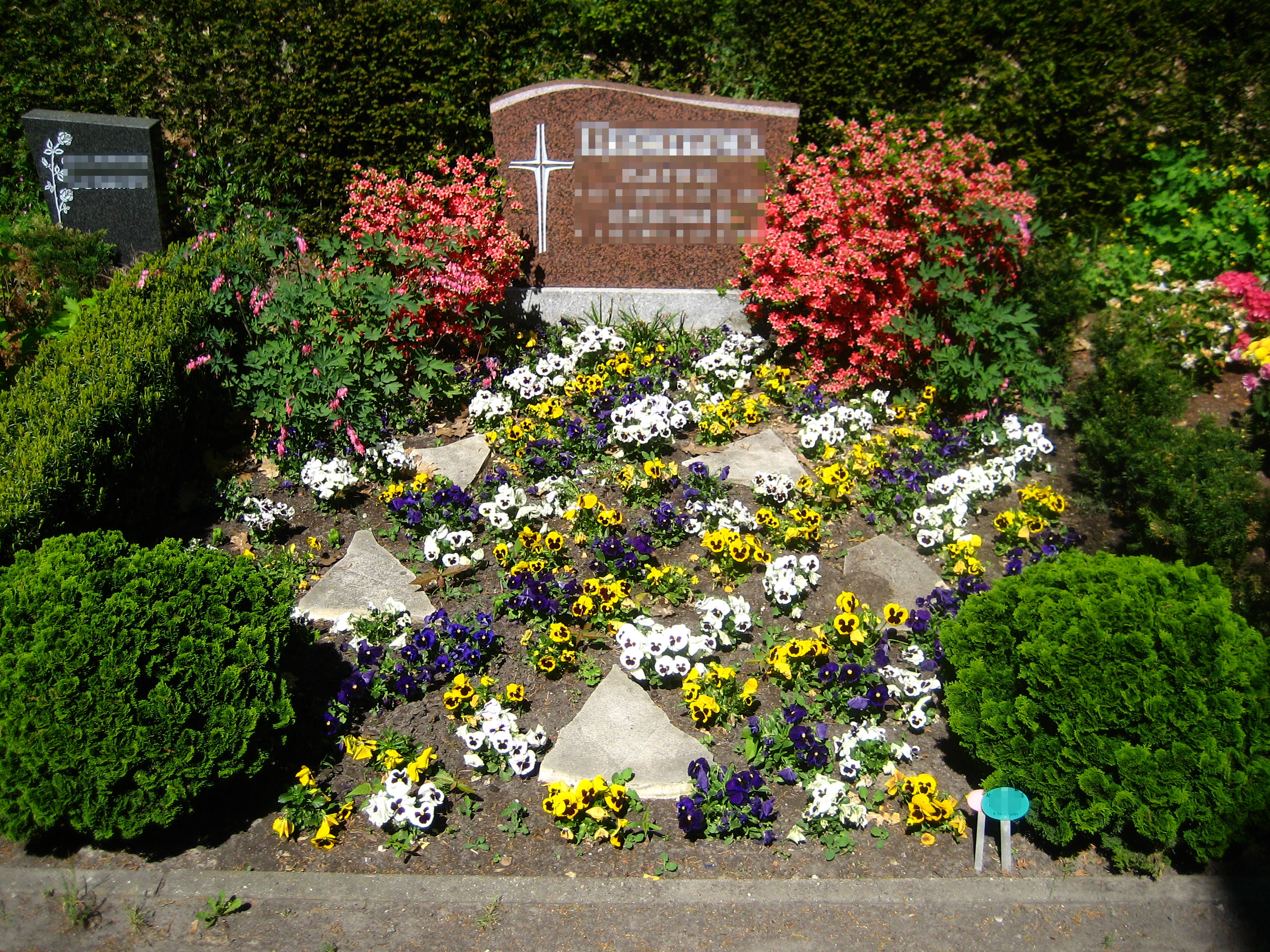 Eine wechselnde Bepflanzung abgestimmt auf die Saison bietet Abweschlung und garantiert vor allem zu jeder Zeit einen üppigen Blühaspekt und eine schön anzuschauende Grabstelle. Typischerweise werden im Frühling Hornveilchen, Stiefmütterchen oder auch Zwiebelblüher, im Sommer Eisblumen und Fleißige Lieschen und schließlich im Herbst Callunen, Silberblatt oder auch der sog. Stacheldraht gepflanzt. Diese Pflanzen kommen nach unserer Erfahrung am besten mit den oft eher schattigen, sandigen und mäßig frischen Standortbedingungen auf den Friedhöfen zurecht und blühen recht ausdauernd.