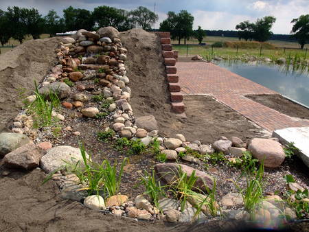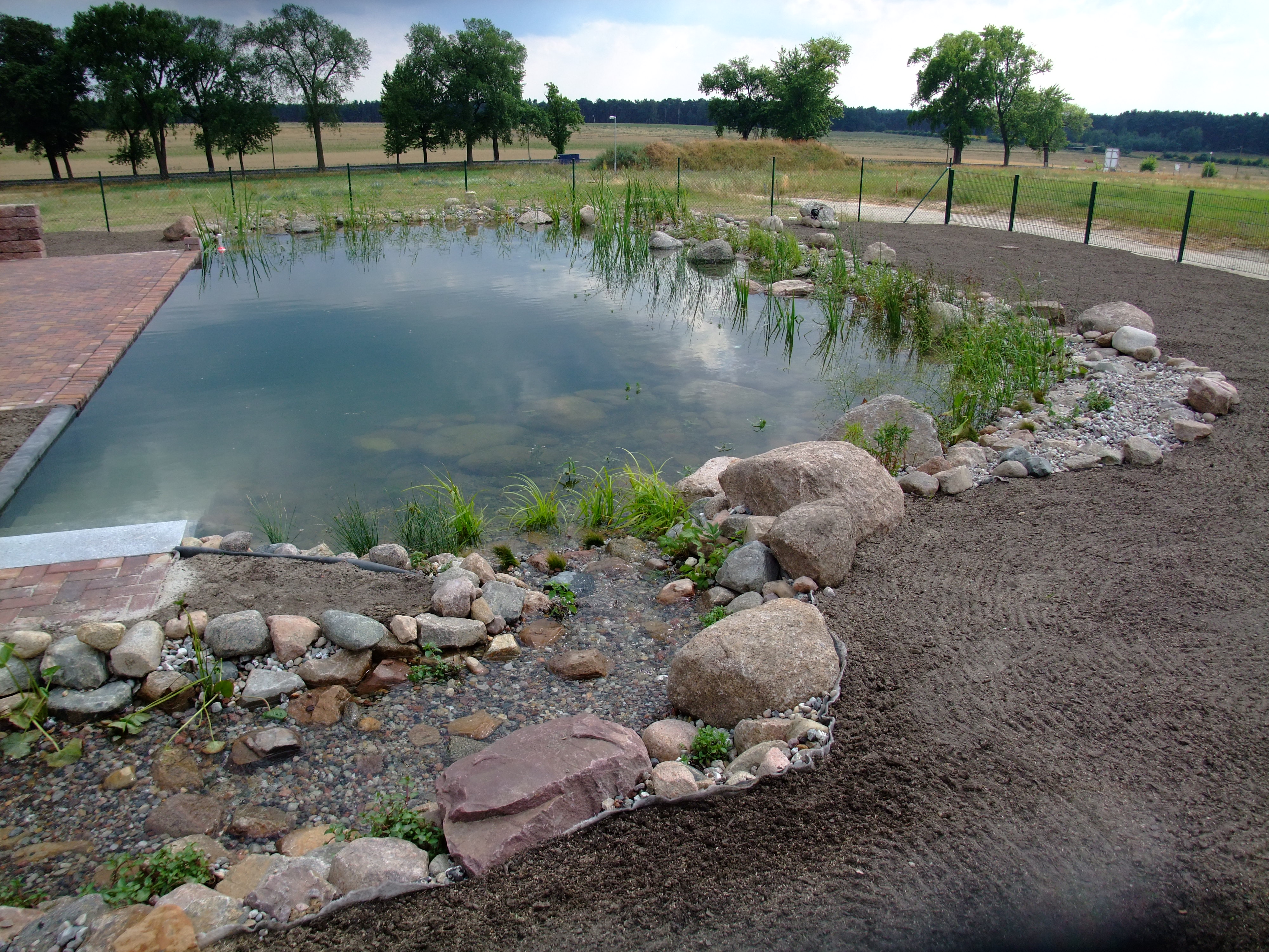 In größeren Dimensionen gedacht bietet ein Schwimmteich neben den genannten Effekten noch gleich die Möglichkeit zur Abkühlung in den eigenen grünen Wänden. Je nach Platzangebot ist ein Naturpool mit größerem Technikeinsatz bis hin zum Naturbadeteich mit natürlicher Regenerationszone und dementsprechendem geringen Technikeinsatz möglich.